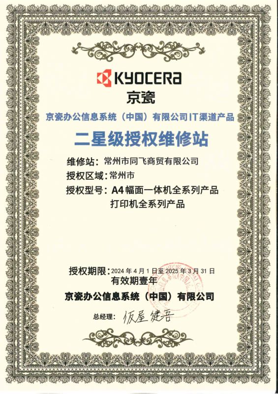 公司取得了日本京瓷復(fù)印機(jī)、打印機(jī),映美針式打印機(jī)、天威耗材、安興紙業(yè)等眾多知名品牌常州地區(qū)代理權(quán)。